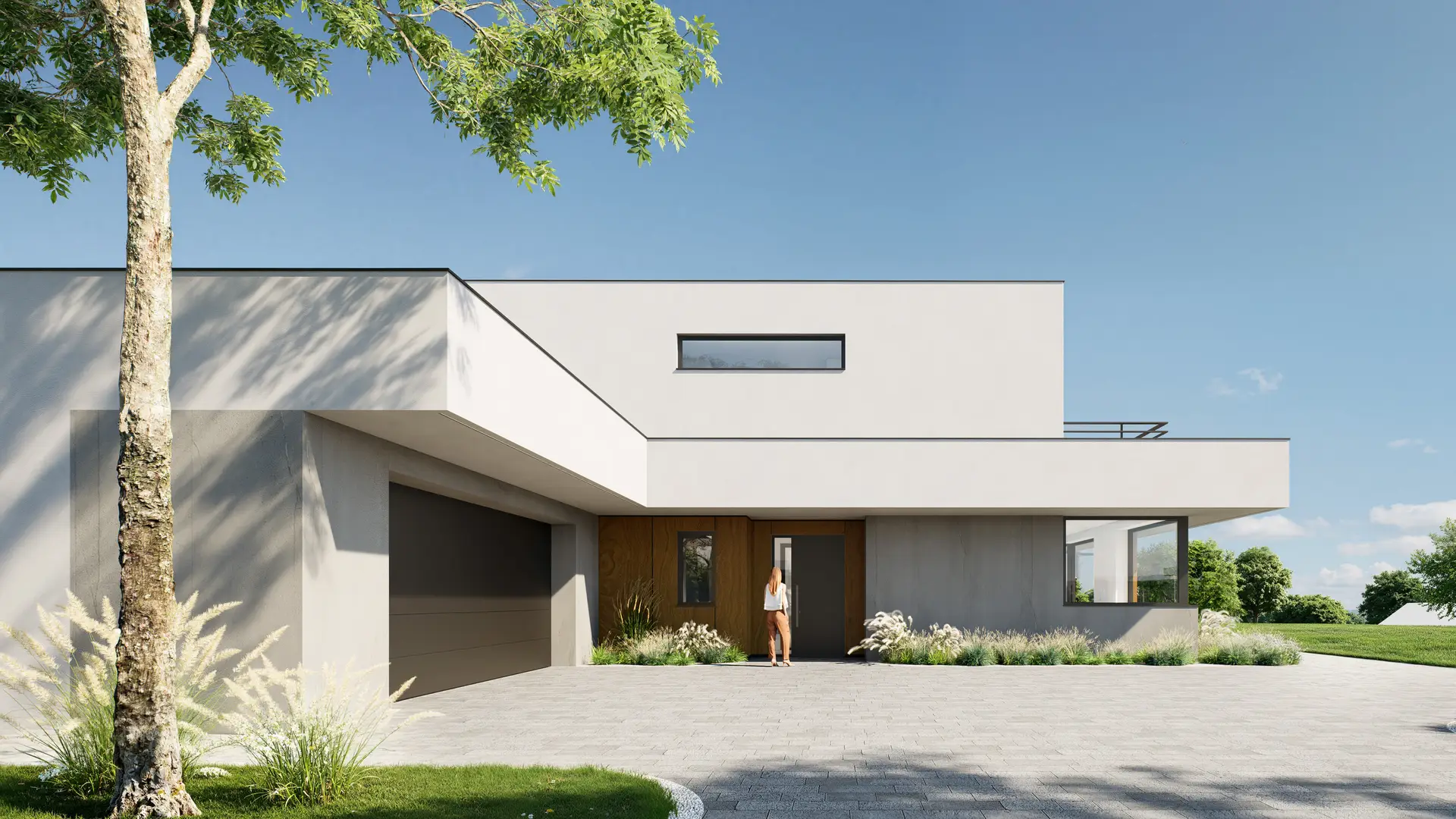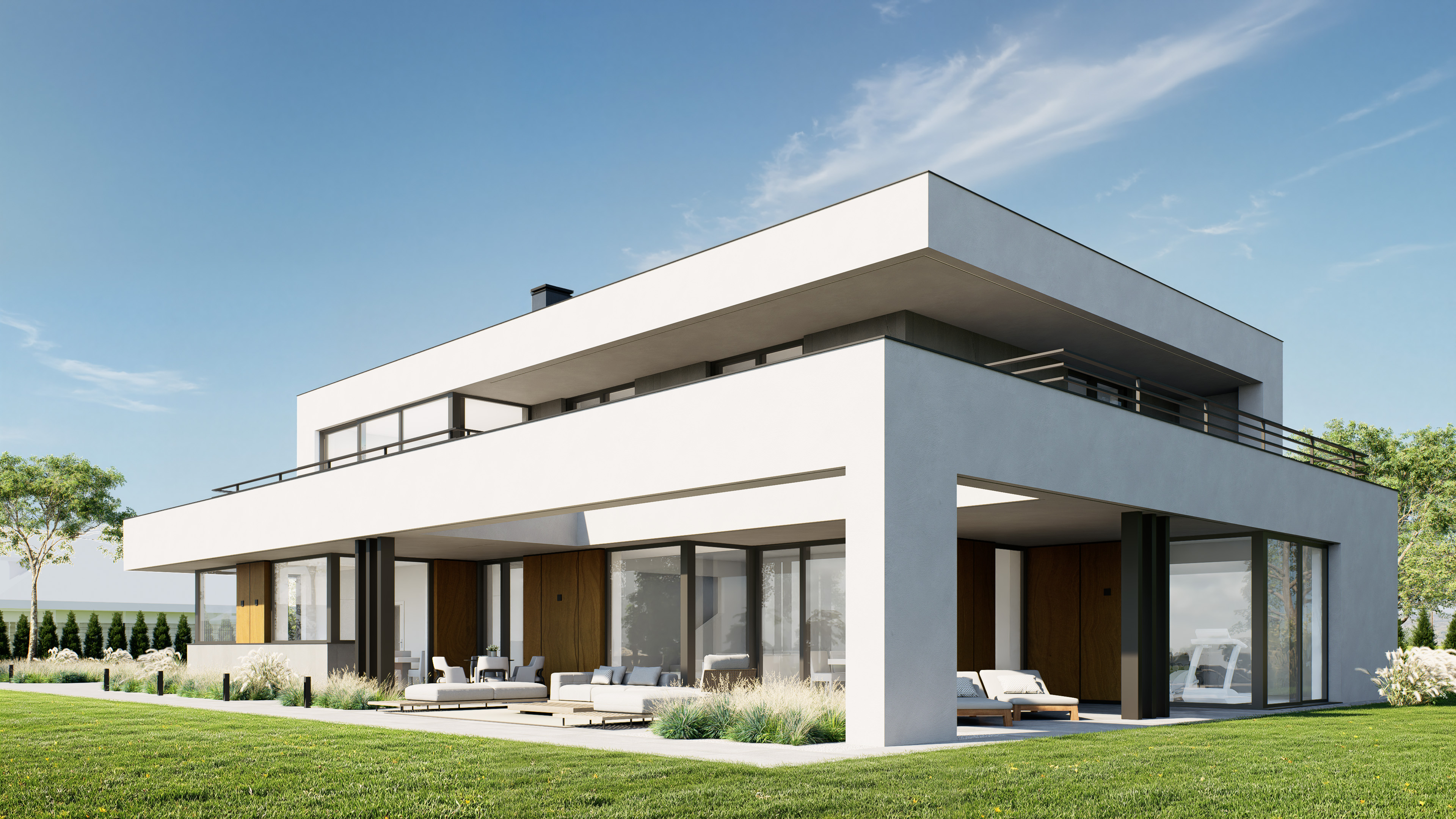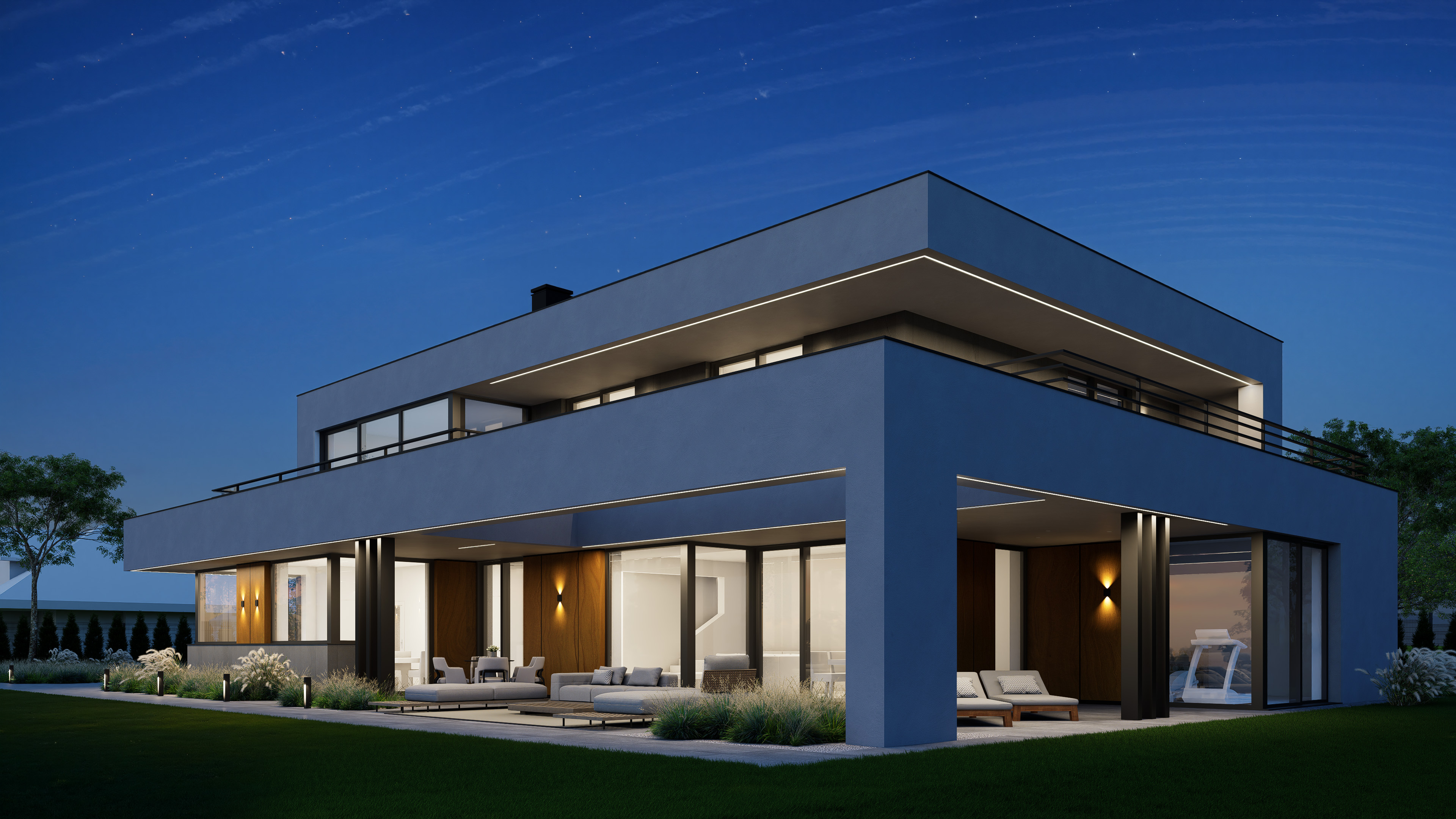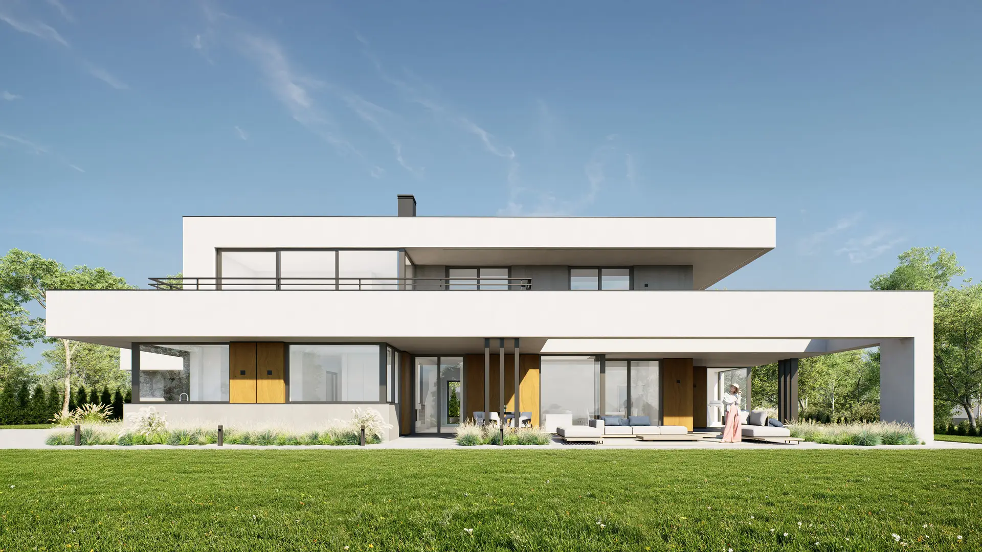 Zamierzeniem projektowym było uzyskanie współczesnej stylistyki modernistycznej willi. W obiekcie wyodrębnić można bryłę główną krytą czterospadowym dachem ukrytym za niewielką attyką oraz bryłę garażu na której znalazł się taras. Bryły powiązane są ze sobą stylistycznie za pomocą elementu białej wstęgi która przebiega wzdłuż całej kondygnacji parteru stając się, począwszy od garażu, zadaszeniem wjazdu, zadaszeniem strefy wejściowej, częścią barierki tarasu na piętrze i na końcu elementem ramy definiującej przestrzennie strefę otwartego patio. Element wstęgowy pojawia się również na kondygnacji piętra, kryjąc dach i stając się zadaszeniem tarasów. Elewacje – wschodnia, południowa i zachodnia, otrzymały dodatkowo wykończenie za pomocą okładzin z płyt gresowych i płyt wykończonych fornirem naturalnym.
