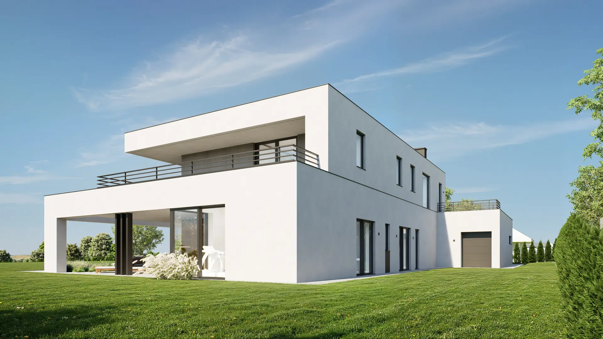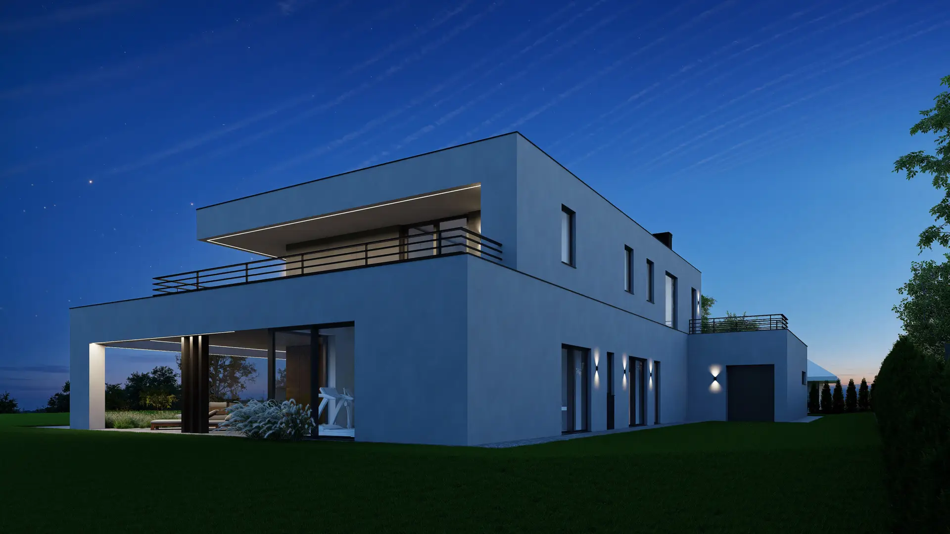 Projekt dwukondygnacyjnej willi zlokalizowanej w północnej części dużej, widokowej działki o kształcie rombu, znajdującej się w sąsiedztwie lasu brzozowego około 60 km od Krakowa.